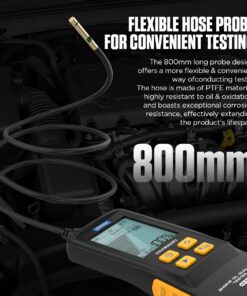 - Hose probe design: The 800mm long probe design offers a more flexible and convenient way of conducting tests. The hose’s PTFE material resists oil and oxidation, and its exceptional corrosion resistance effectively extends the product’s lifespan.