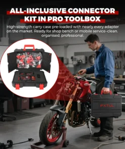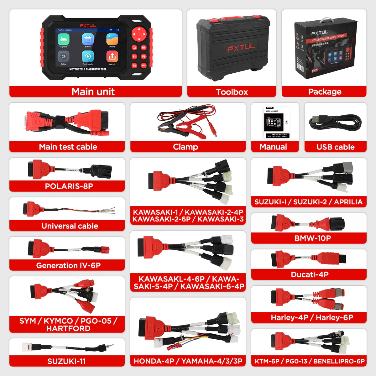 The FXTUL M7 Motorcycle Diagnostic Tool is a professional all-in-one scanner designed specifically for motorcycles. The M7 supports more than 70 global brands and more than 10,000 models from Asia, Europe and the Americas, and provides in-depth system diagnostics for ECM, ABS, TPMS, IMMO and more. It offers near OEM-grade features such as DTC read/clear, live data, perform tests and ECU reset.