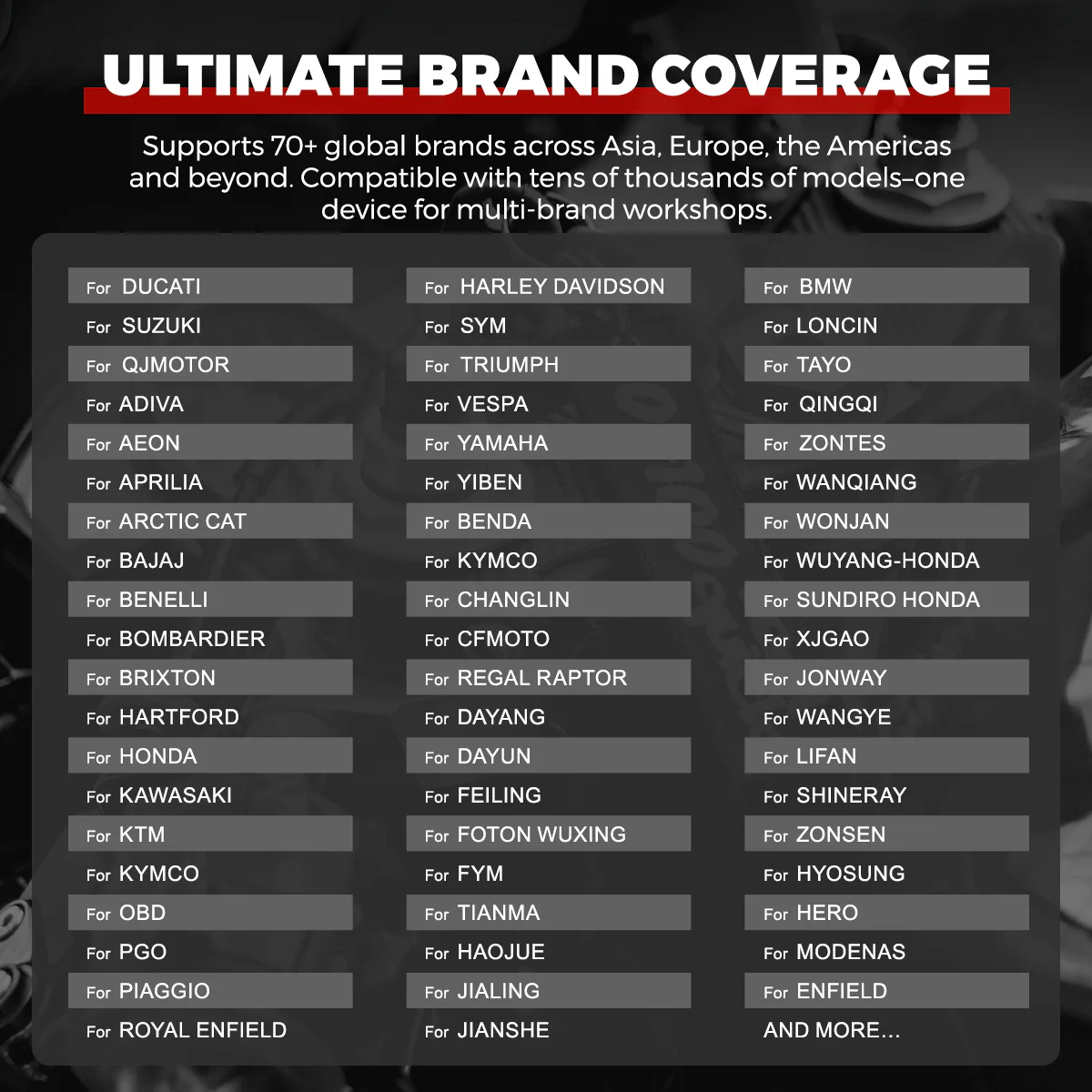 Support 70+ brands: M7 motorcycle diagnostic tool supports 76 common motorcycle models including Harley, Moto Guzzi, Ducati, Honda, etc.