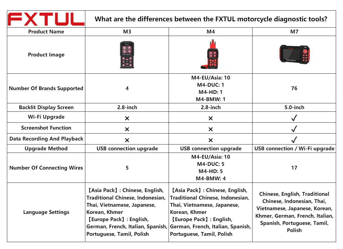What are the differences between the FXTUL motorcycle diagnostic tools?