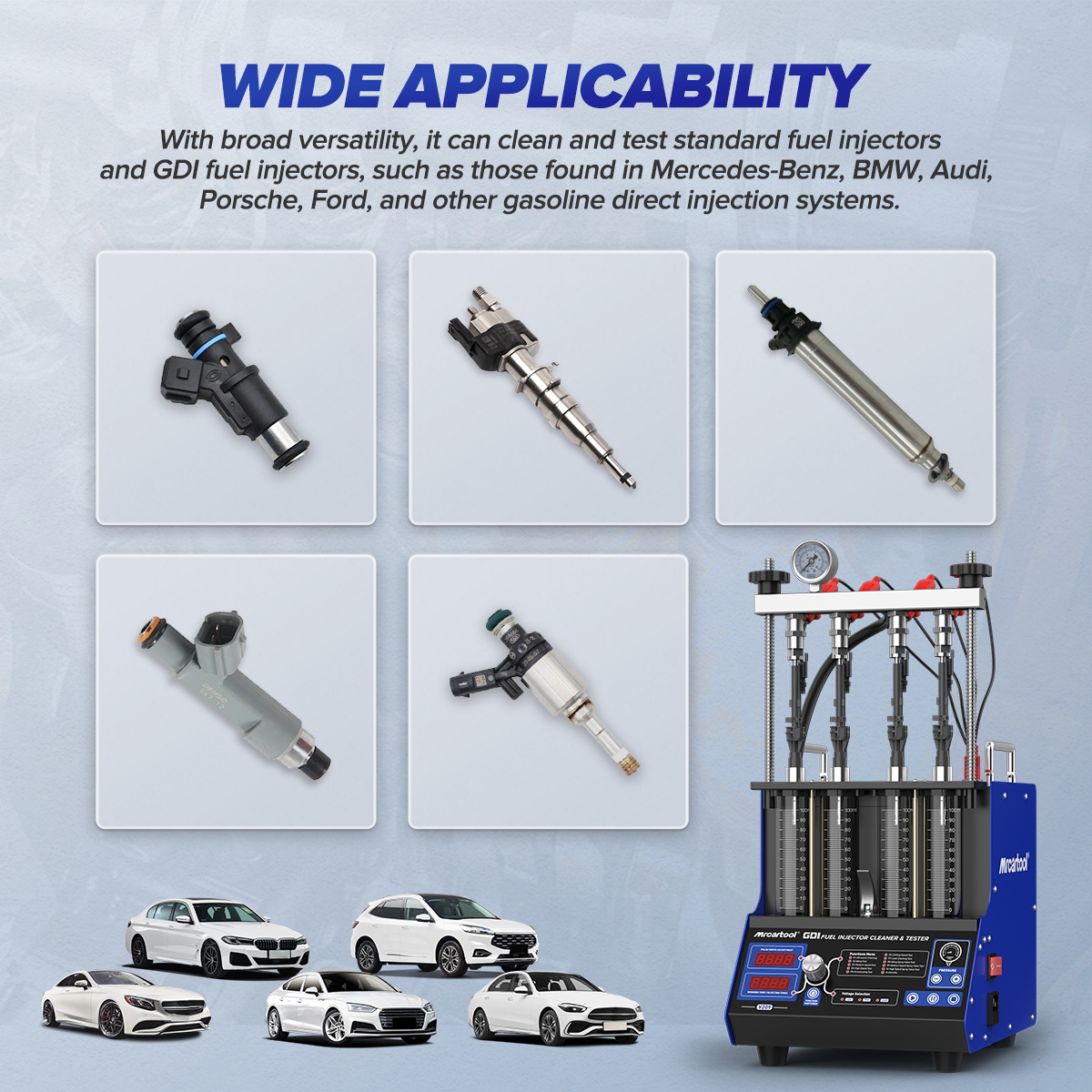 - Compatible Variety Injectors: it can clean and test standard injectors, GDI, FEI and FSI injectors. It is suitable for direct injection engines from Mercedes-Benz, BMW, Audi, Porsche and Ford.