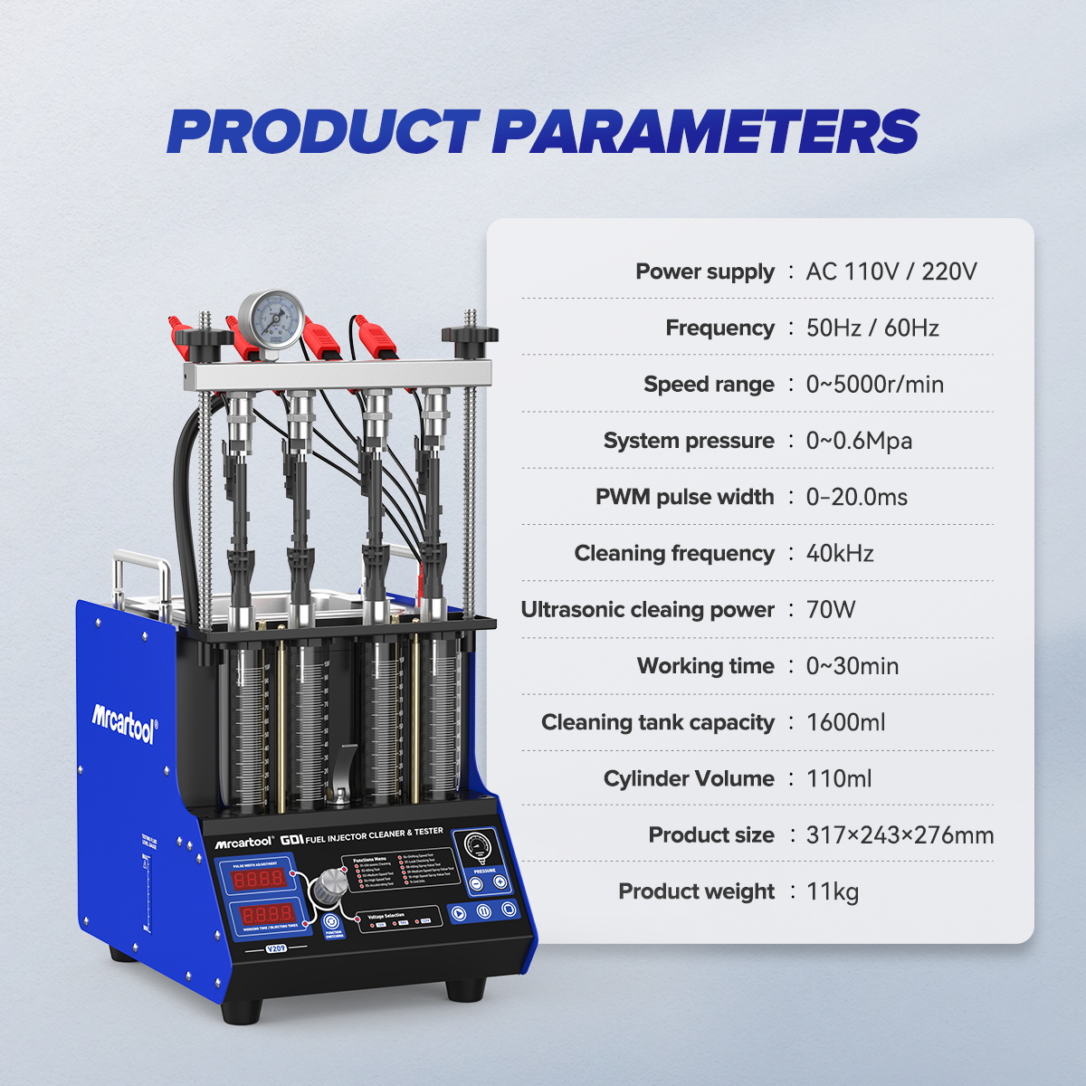 - Ultrasonic Cleaning: MRCARTOOL V209 Fuel Injector Test Tool has a cleaning tank capacity of 1600ml, which can clean 6 nozzles at the same time, no need to repeat the operation, speeding up your work efficiency.